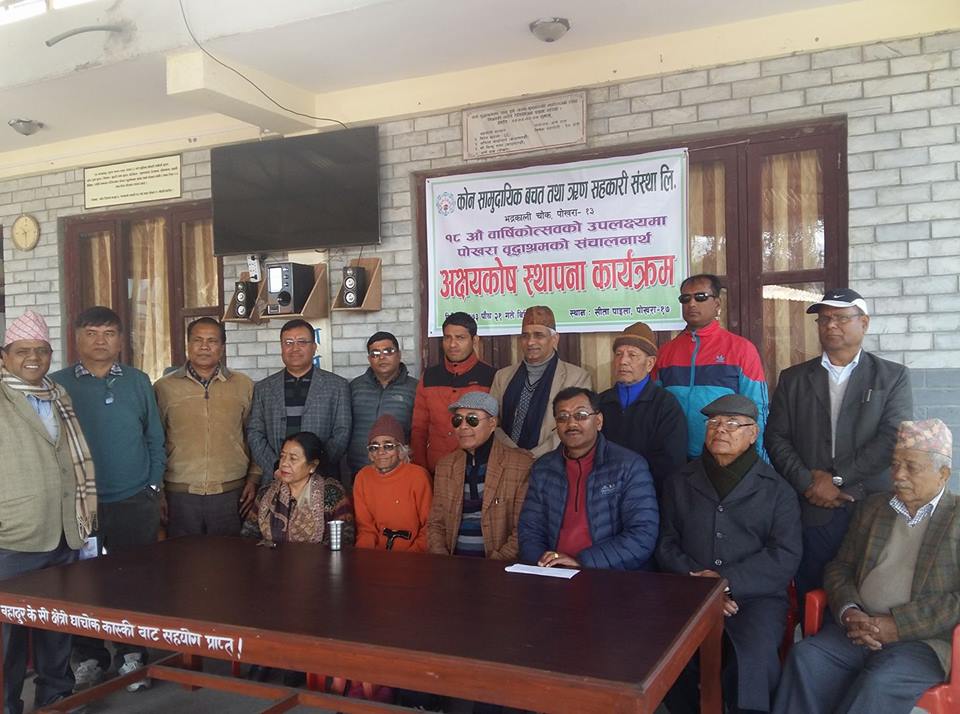 पोखरा–१३ भद्रकालीमा रहेको कोन सामुदायिक बचत तथा ऋण सहकारी संस्था लि.ले पोखरा बृद्धाश्रममा आश्रित ज्येष्ठ नागरिकहरुको सहयोगार्थ अक्षयकोष स्थापना गरेको छ । आफ्नो बार्षिकोत्सवका अवसरमा सामाजिक उत्तरदायित्वको कार्यक्रम अन्तर्गत कोन सहकारीले १ लाख १ हजार १ सय १५ रुपैयाँको पोखरा बृद्धाश्रम कोन सहकारी अक्षयकोष स्थापना गरेको हो । अक्षयकोष स्थापना कार्यक्रममा बोल्दै कोन सहकारी संस्थाका अध्यक्ष शरदकान्त सिग्देलले अक्षयकोषको व्याजबाट ज्येष्ठ नागरिकहरुलाई भोजन, स्वास्थ्योपचार लगायतका आवश्यक काममा खर्च गर्न सक्ने गरी सहयोग गरिएको बताए । पोखरा बृद्धाश्रमका अध्यक्ष बसन्तकेशव पराजुलीले सहकारीका तर्फबाट प्राप्त भएको सहयोगप्रति आभार प्रकट गर्दै सहकारीको उत्तरोत्तर प्रगतिको कामना गरे। कार्यक्रममा कोन सहरकारीका उपाध्यक्ष तीर्थ बस्नेत, सचिव शान्तकुमार श्रेष्ठ, बृद्धाश्रमका उपाध्यक्ष टिकाबहादुर भण्डारी, सहकारी संचालक समितिका सदस्यहरु, प्रबन्धक शोभाकान्त भट्टराई लगायतको उपस्थिति रहेको थियो । ३ हजार भन्दा बढी शेयर सदस्य रहेको कोन सहकारीले बार्षिक १ अर्व भन्दा बढीको आर्थिक कारोकार गर्दै आएको छ । यस्तै काभ्रेको बनेपा घर भई पोखरामा नर्सिङ प्राध्यापन पेशामा संलग्न चाहना अधिकारीले आफ्नी साढे ३ बर्षकी छोरी विभु श्रेष्ठको नाममा ३० हजार नगद सहयोग गरेका छन् । पोखरा बृद्धाश्रममा असहाय एवं वेवारिसी अवस्थाका ६५ जना आश्रित रहेका छन् ।